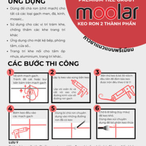Chiều rộng đường ron phù hợp để sử dụng sản phẩm này là từ 1-10mm, tuy nhiên đường ron rộng 2-3 mm là chiều rộng tốt nhất cho keo ron 2 TP Moolar về chất lượng và thẩm mỹ. Độ sâu đường ron tối thiểu 3mm, cần làm sạch đường ron trước khi chà keo ron Moolar.